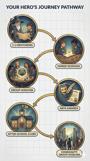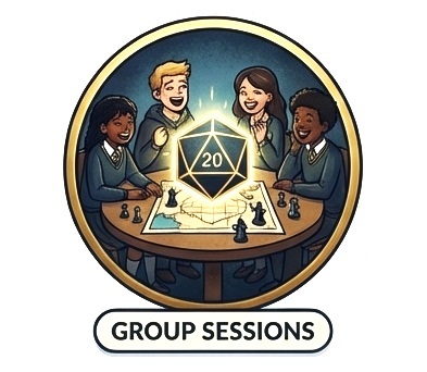 In many sessions, students work within imaginative, rule-based scenarios drawn from tabletop roleplaying frameworks (such as Dungeons & Dragons). These provide a safe, low-pressure environment in which young people can practise decision-making, explore values, and rehearse real-world social situations within clear boundaries and expectations.
