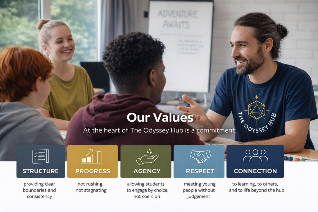 The Odyssey Hub provides an alternative educational provision for young people who are disengaged from mainstream education. We specialise in gradual re-engagement through structured, supportive, and creative learning environments, particularly for students who struggle with traditional classroom-based approaches.